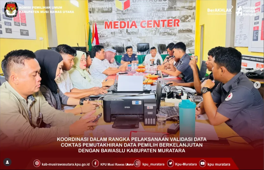 KPU Kabupaten Musi Rawas Utara melaksanakan Koordinasi dalam rangka pelaksanaan validasi data Coktas Pemutakhiran Data Pemilih Berkelanjutan Tingkat Kabupaten Musi Rawas Utara bersama Badan Pengawas Pemilu Musi Rawas Utara pada Senin, 08 September 2025. Turut hadir Ketua KPU dan Anggota KPU Musi Rawas Utara bersama Ketua dan Anggota Bawaslu Musi Rawas Utara