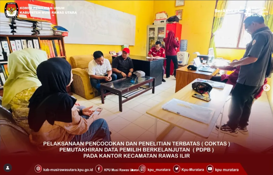 Ketua KPU Musi Rawas Utara Heriyanto didampingi Anggota KPU Musi Rawas Utara Aang Samudra dan Putiha Rakhmaini didampingi oleh Kasubbag melaksanakan Koordinasi Data Pemilih Hasil Coktas di Kantor Kecamatan Rawas Ilir pada Kamis, 18 September 2025.