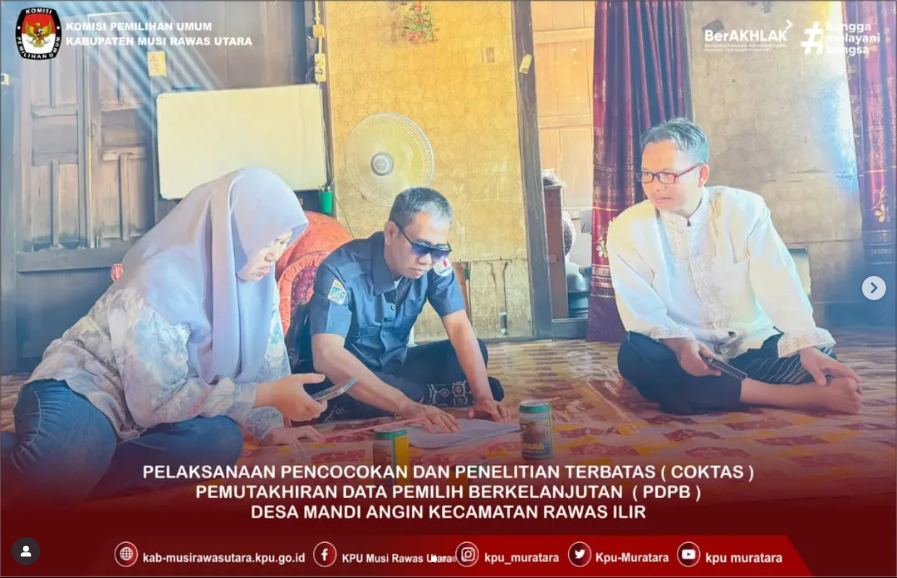 Ketua KPU Musi Rawas Utara Heriyanto didampingi Anggota KPU Musi Rawas Utara Aang Samudra dan Putiha Rakhmaini serta Kasubbag melaksanakan Kegiatan Pencocokan dan Penelitian Data Pemilih Terbatas (Coktas) di Desa Mandi Angin Kecamatan Rawas Ilir pada Kamis, 18 September 2025.