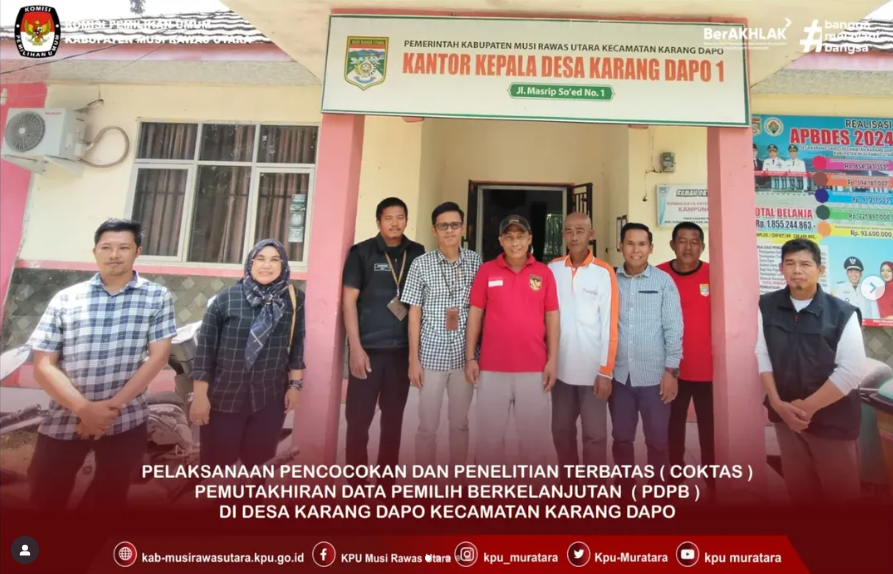 Anggota KPU Kabupaten Musi Rawas Utara Yupran Abadi dan Jemi Haryanto didampingi Sekretaris KPU Musi Rawas Utara Syamsiah beserta jajaran melaksanakan Pencocokan dan Penelitaj Data Pemilih Terbatas (Coktas) di Desa Karang Dapo, Kecamatan Karang Dapo pada Jumat, 19 September 2025.