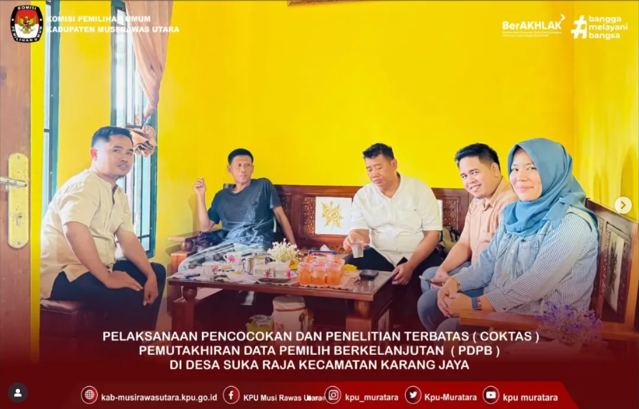 Ketua KPU Musi Rawas Utara Heriyanto didampingi Anggota KPU Musi Rawas Utara Aang Samudra dan Putiha Rakhmaini serta Kasubbag dan jajaran melaksanakan Kegiatan Pencocokan dan Penelitian Data Pemilih Terbatas (Coktas) di Desa Sukaraja Kecamatan Karang Jaya pada Jumat, 19 September 2025.