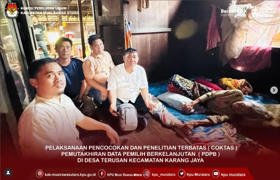 Ketua KPU Musi Rawas Utara Heriyanto didampingi Anggota KPU Musi Rawas Utara Aang Samudra dan Putiha Rakhmaini serta Kasubbag dan jajaran melaksanakan Kegiatan Pencocokan dan Penelitian Data Pemilih Terbatas (Coktas) di Desa Terusan Kecamatan Karang Jaya pada Jumat, 19 September 2025.