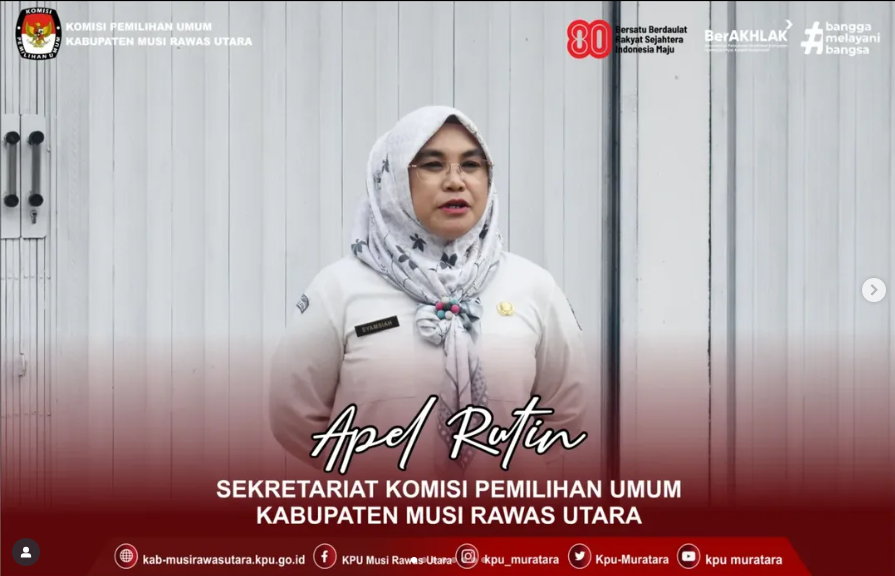 Komisi Pemilihan Umum Kabupaten Musi Rawas Utara melaksanakan Apel Rutin pada Senin, 25 Agustus 2025. Bertindak sebagai pembina Apel Sekretaris KPU Musi Rawas Utara Ibu Syamsiah, SH, MH.