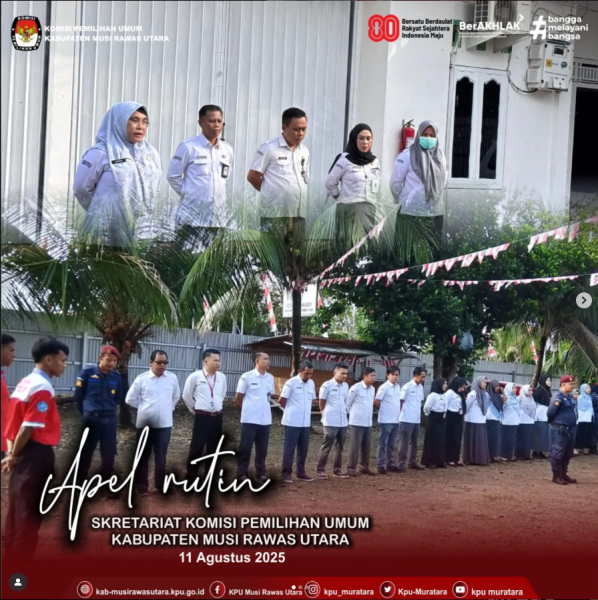 KPU Kabupaten Musi Rawas Utara melaksanakan Apel Pagi Rutin pada Senin, 11 Agustus 2025. Bertindak sebagai pembina Apel Sekretaris KPU Musi Rawas Utara Ibu Syamsiah, SH, MH.