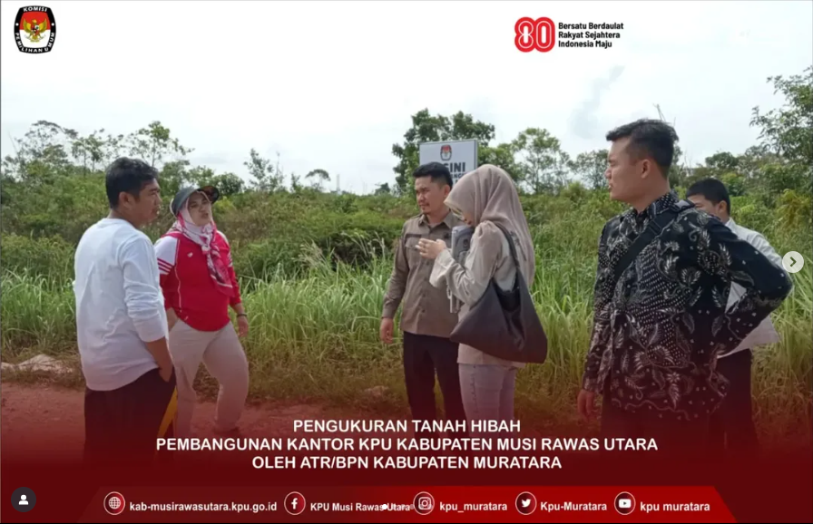 KPU Musi Rawas Utara melaksanakan Kegiatan Pengukuran Tanah Hubah Pembangunan Kantor KPU Musi Rawas Utara oleh ATR/BPN Kabupaten Musi Rawas Utara pada Kamis, 14 Agustus 2025.