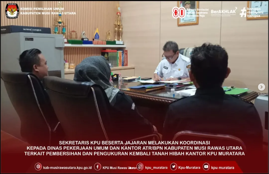 Sekretaris KPU Musi Rawas Utara Ibu Syamsiah didampingi Kasubag Teknis dan Hukum Bapak Busairi dan Staf Bapak Andi Kurnia melaksanakan Koordinasi Kepada Dinas Pekerjaan Umum dan Kantor ATR/BPN Kabupaten Musi Rawas Utara terkait Pembersihan dan Pengukuran Kembali Tanah Hibah Kantor KPU Kabupaten Musi Rawas Utara pada Rabu, 13 Agustus 2025.