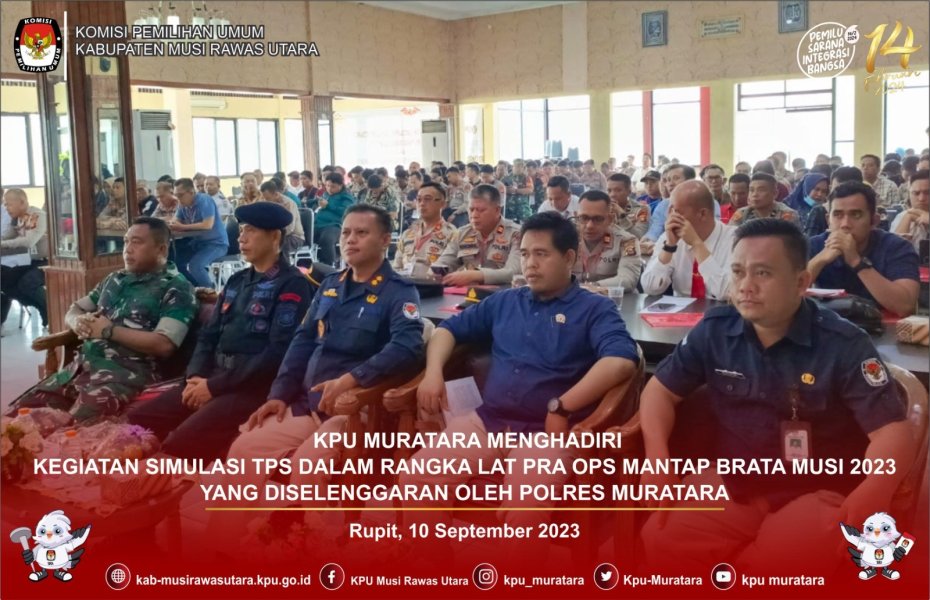#TemanPemilih, KPU Musi Rawas Utara berkesempatan hadir dalam acara Lat Pra Ops Mantap Brata Musi 2023 yang diselenggarakan oleh Polres Musi Rawas Utara pada Selasa, 10 Oktober 2023 di Gedung Siti Rahma, Rumah Makan Sederhana Rupit, Kabupaten Musi Rawas Utara.