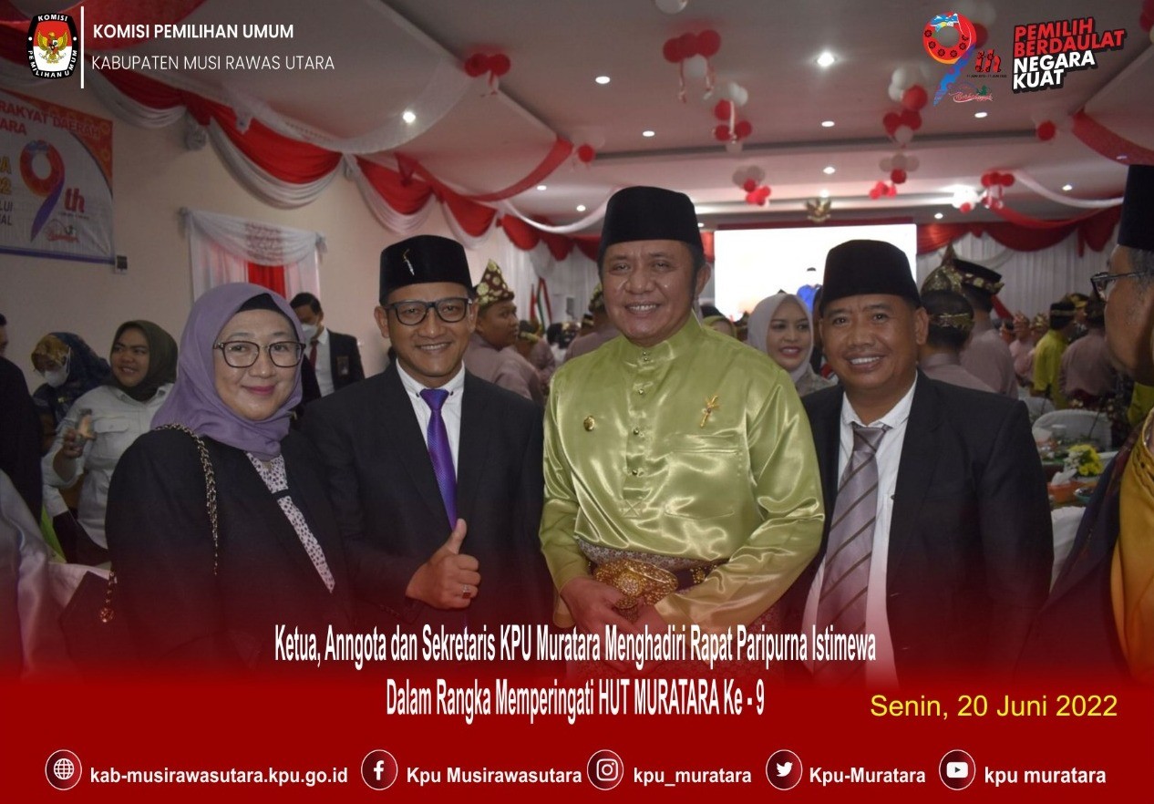 Rupit, kab-musirawasutara.kpu.go.id - Senin 20 Juni 2022, Ketua dan Anggota beserta Sekretaris Komisi Pemilihan Umum Kabupaten Musi Rawas Utara menghadiri Sidang Paripurna perayang ulang tahun Kabupaten Musi Rawas Utara ke-9. Acara dibuka oleh ketua DPRD Kabupaten Musi Rawas Utara Efriansyah, dalam sambutannya Efri mengucapkan terima kasih kepada panitia dan tamu undangan yang telah bersedia hadir. Kemudian acara dilanjutkan dengan sambutan Bupati Musi Rawas Utara Devi Suhartoni. Bupati Musi Rawas Utara ini memaparkan pencapaian yang telah diraih dalam masa satu setengah tahun kepemimpinan Devi-Innayatullah. Salah satunya adalah keberhasilan peningkatan pertumbuhan ekonomi dari 0,3 pada akhir 2020 menjadi 2,3 pada akhir 2021. Faktor capaian tersebut adalah karena menurunnya kasus Covid-19 di Musi Rawas Utara. Peningkatan pertumbuhan ekonomi tersebut disumbang oleh tiga sektor utama yakni ; pertanian dan perkebunan, pertambangan serta perdagangan.