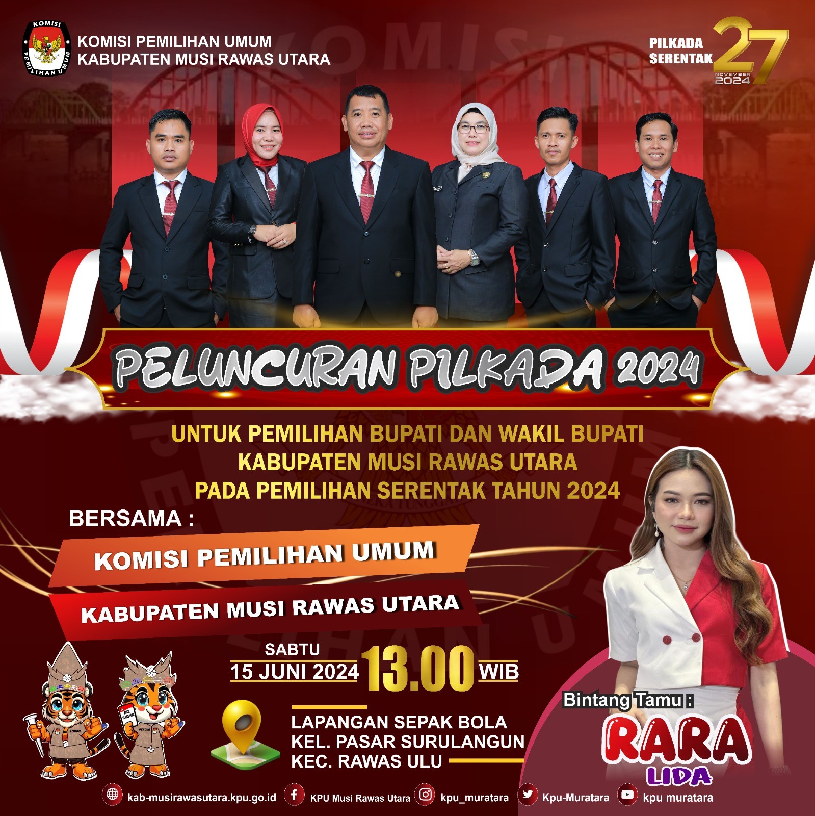 #TemanPemilih, Kami Segenap Keluarga Besar KPU Musi Rawas Utara mengundang Seluruh Masyarakat Kabupaten Musi Rawas Utara untuk bersama-sama datang Ke Lapangan Sepak Bola Kecamatan Rawas Ulu pada Sabtu, 15 Juni 2024 mulai pukul 13:00 WIB untuk menyaksikan "PELUNCURAN PEMILIHAN BUPATI DAN WAKIL BUPATI KABUPATEN MUSI RAWAS UTARA TAHUN 2024" dengan menampilkan Bintang Tamu RARA LIDA.