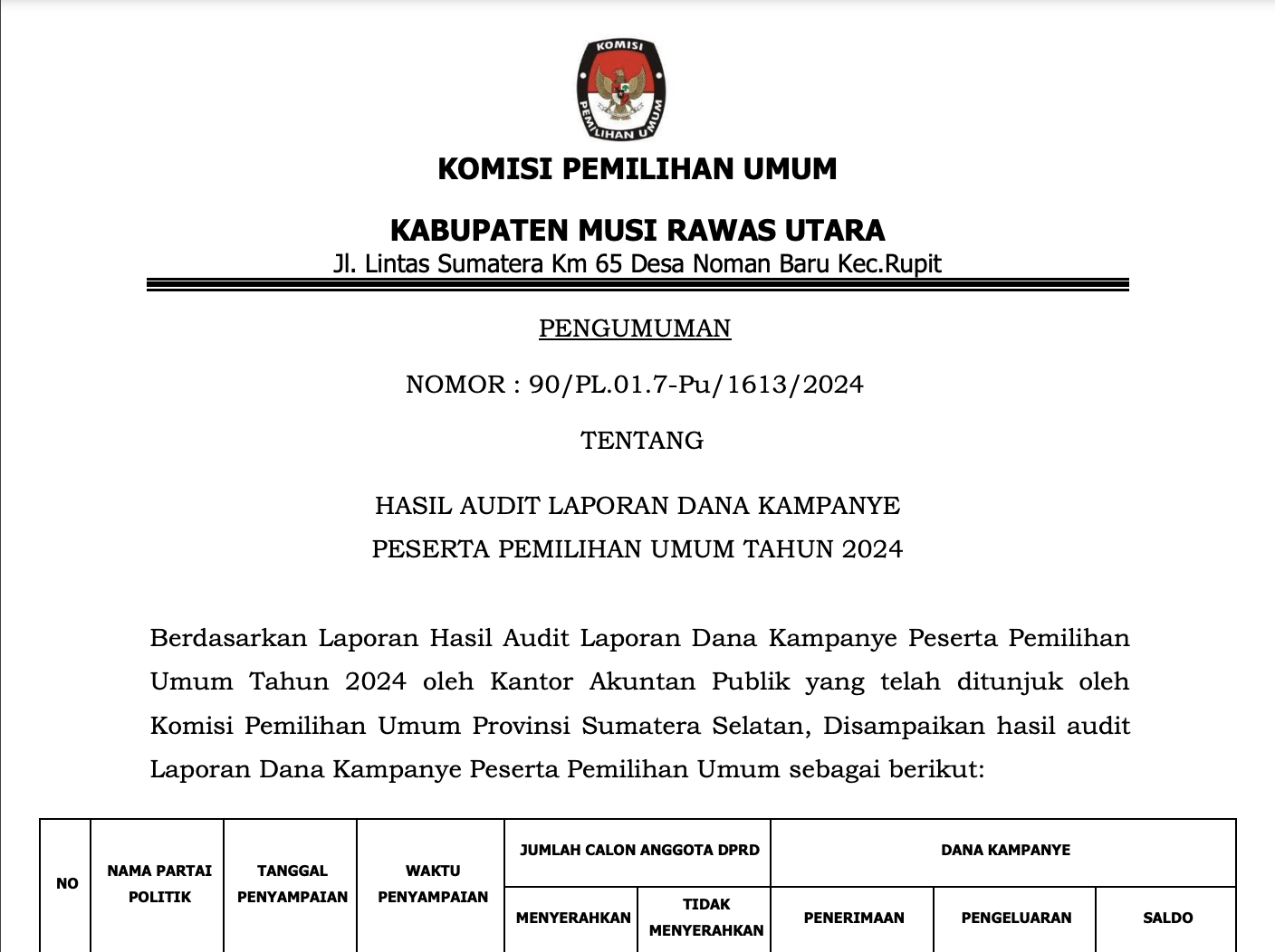 #TemanPemilih, Berikut disampaikan Pengumuman Hasil Audit Laporan Dana Kampanye Peserta Pemilu 2024 di Kabupaten Musi Rawas Utara