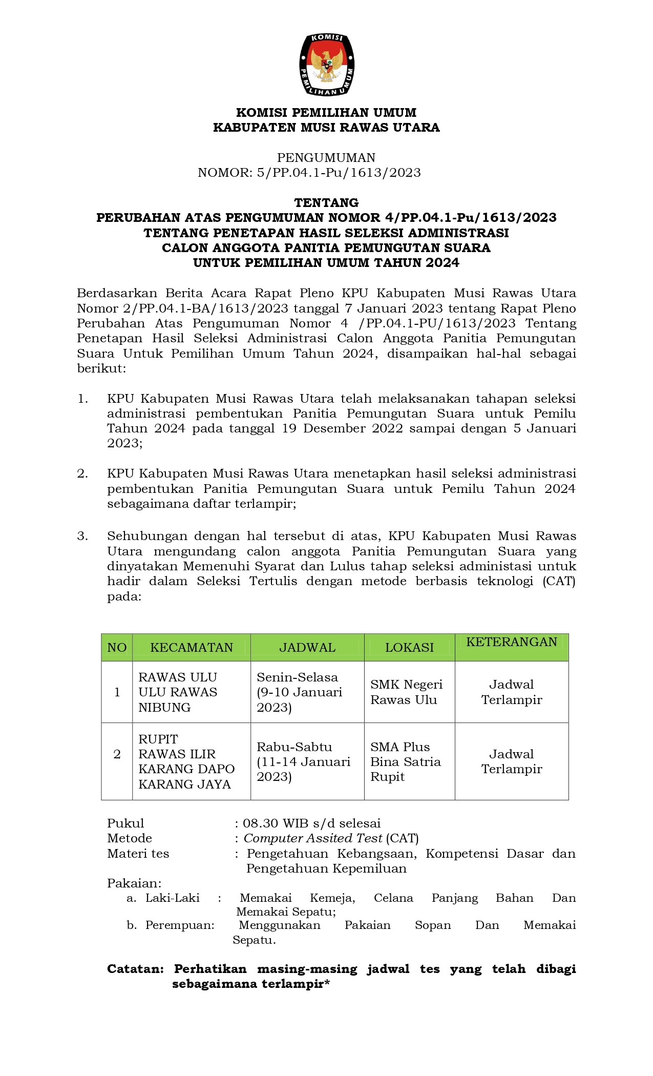 #TemanPemilih, Berikut disampaikan Pengumuman Hasil Seleksi Administrasi Calon Anggota Panitia Pemungutan Suara dan Jadwal Seleksi Tertulis Calon Anggota PPS di Kabupaten Musi Rawas Utara pada Pemilihan Umum Tahun 2024 dapat diunduh pada link dibawah inI