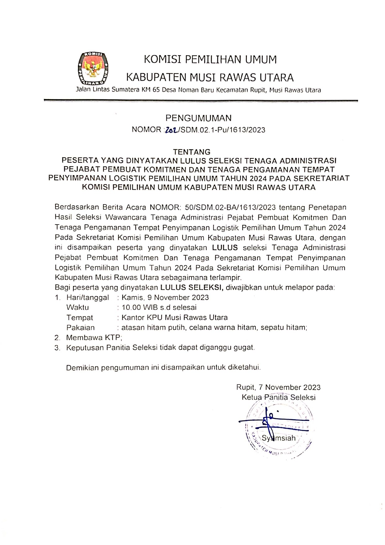 #TemanPemilih, Berikut Disampaikan Pengumuman Hasil Seleksi Wawancara Calon Tenaga Adminsitrasi Pejabat Pembuat Komitmen dan Tenaga Pengamanan Gudang Logistik KPU Musi Rawas Utara pada Pemilu 2024.