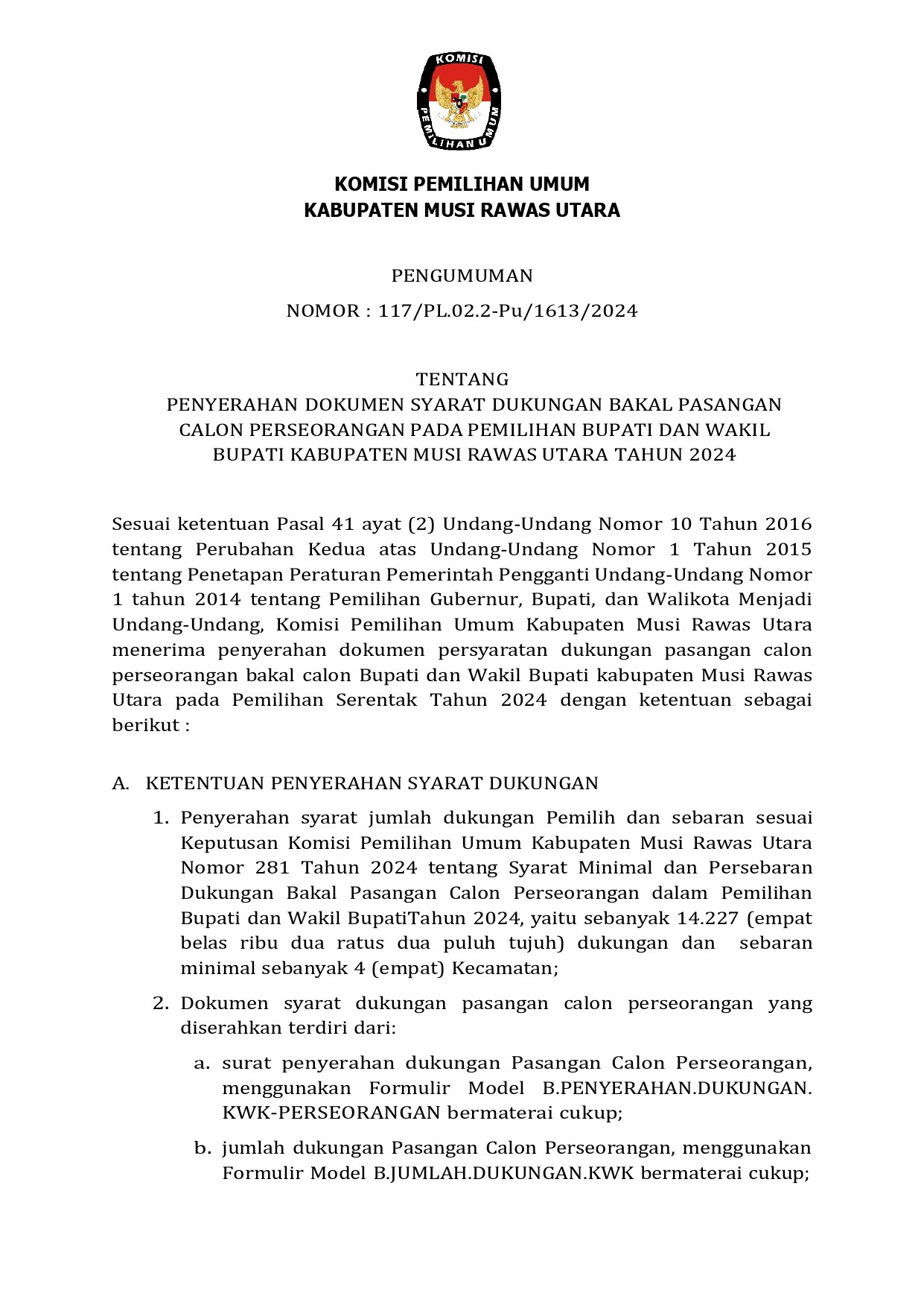 Pengumuman Penyerahan Dokumen Dukungan Pencalonan Perseorangan pada Pemilihan Bupati dan Wakil Bupati Musi Rawas Utara Tahun 2024