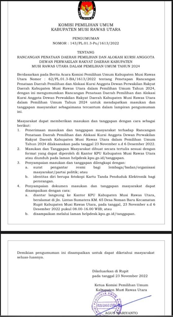 #TemanPemilih, KPU Musi Rawas Utara mengeluarkan Pengumuman Nomor 143/PL.01.3-Pu/1613/2022 tentang Penetapan Rancangan Usulan Daerah Pemilihan dan Alokasi Kursi Dewan Perwakilan Rakyat Daerah Kabupaten Musi Rawas Utara pada Pemilu Tahun 2024