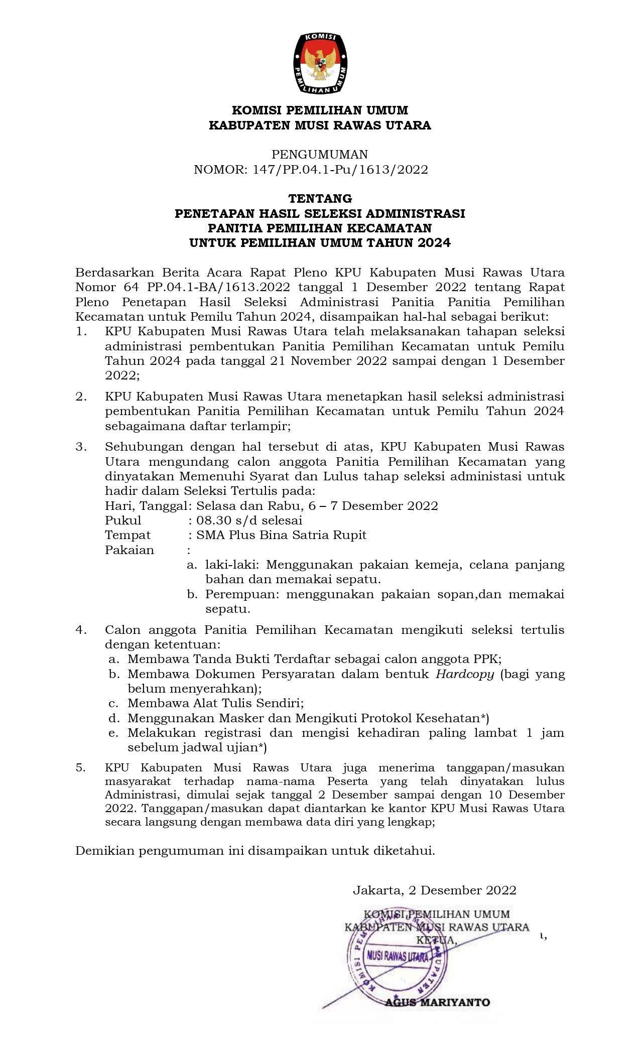 #TemanPemilih, KPU Musi Rawas Utara mengumumkan melalui Surat Pengumuman Nomor 147/PP.04.1-Pu/1613/2022 Tentang Penetapan Hasil Seleksi Administrasi Calon Anggota Panitia Pemilihan Kecamatan pada Pemilihan Umum Tahun 2024 di Kabupaten Musi Rawas Utara.