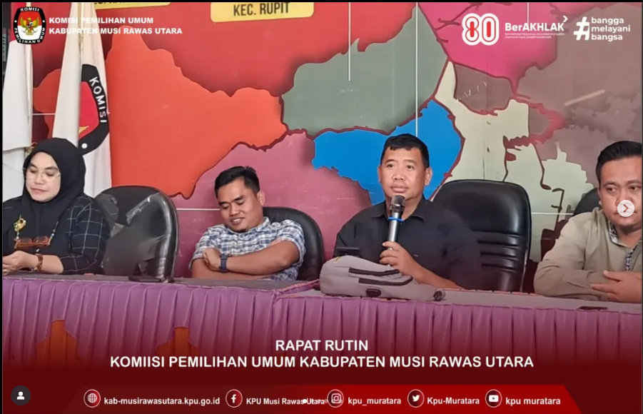 Ketua KPU Musi Rawas Utara Heriyanto, Anggota KPU Musi Rawas Utara Aang Samudra, Sekretaris KPU Musi Rawas Utara Syamsiah, bersama para kasubbag dan staf melaksanakan rapat rutin bulanan pada Kamis, 7 Agustus 2025.