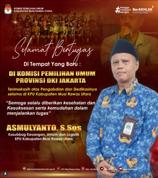 Segenap Keluarga Besar KPU Kabupaten Musi Rawas Utara mengucapkan Selamat Bertugas di Tempat yang Baru kepada Kasubbag Keuangan, Umum, dan Logistik KPU Musi Rawas Utara Bapak Asmulyanto atas penempatan tugas baru di satker KPU Provinsi DKI Jakarta.