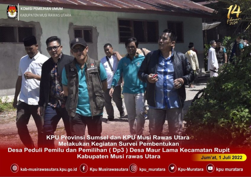 KPU Musi Rawas Utara memfasilitasi kegiatan survey lokasi yang dilaksanakan KPU Provinsi Sumatera Selatan terkait Penentuan Lokus Desa Peduli Pemilu dan Pemilihan. Kegiatan ini dihadiri Anggota KPU Provinsi Sumatera Selatan Hendri Almawijaya, Kepala Bagian Teknis Penyelenggara dan Partisipasi Masyarakat Erland Evriansyah dan staf Subbag Tekmas KPU Provinsi Sumsel.